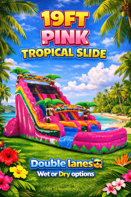 A vibrant 19-foot pink double tropical slide perfect for parties, fundraisers, or backyard fun. This eye-catching inflatable features two side-by-side lanes so two riders can race down safely and simultaneously, making it ideal for friendly competitions and keeping groups entertained. The tropical theme adds a playful, summery look that brightens any event, while the tall 19-foot height delivers an exhilarating, family-friendly thrill. Designed for rental use, it’s easy to set up and supervise, accommodates a steady flow of riders, and creates great photo opportunities. Note: follow attendant guidance and weight/height limits for safe operation.